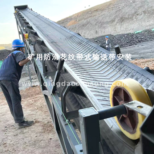 花紋輸送帶是由工作面為花紋狀的覆蓋膠和非工作面為平面的覆蓋膠與帶芯構成的傾角輸送帶。花紋輸送帶也可以成為防滑輸送帶,防滑輸送帶是它的又一別稱。